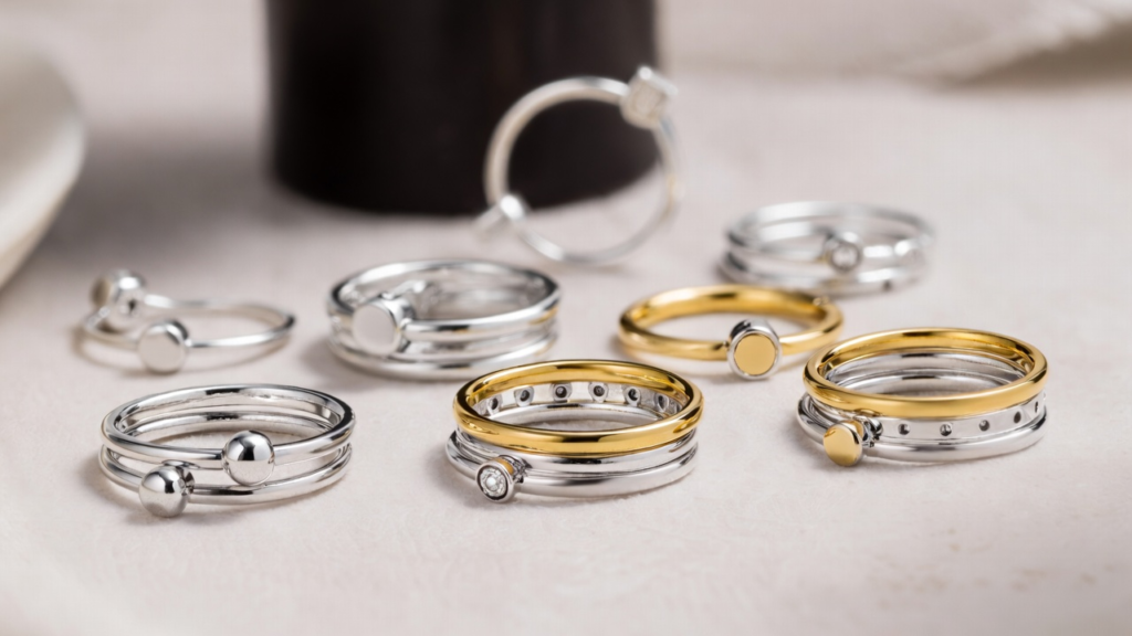 Let’s talk about stacking rings first. They’re the real champions – simple, lightweight bands made from sterling silver or 14k gold (rose gold, too!) that you can wear by the dozens – 3, 5, 7 – you name it! Their magic lies in how they come together. With small differences in width and texture, they sit together so that it never looks bulky or overwhelming (a look that cheaper alternatives don’t usually achieve).